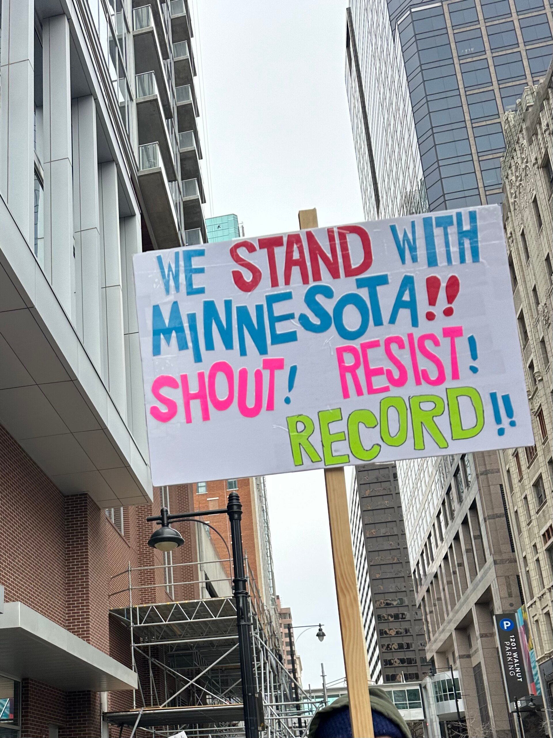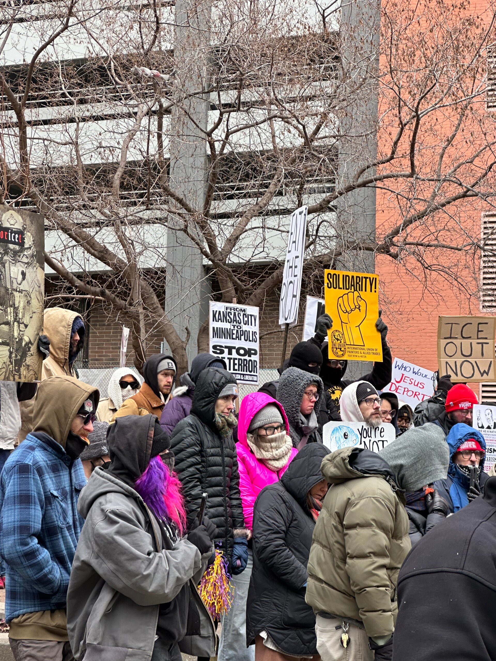 Speakers came out to signal morale and speak to the transgressions at hand, standing in solidarity with Minnesota and voicing ICE opposition in Kansas City. Hoots and hollers welcomed and concluded the speakers with muffled glove claps and car horns in the mix.