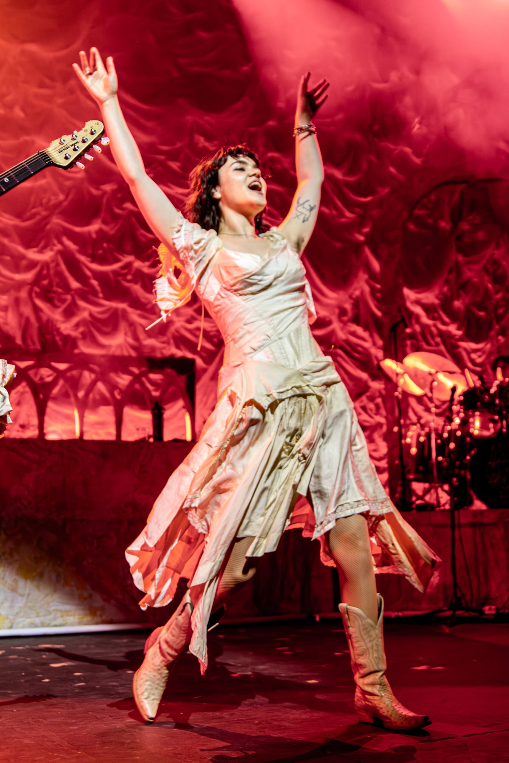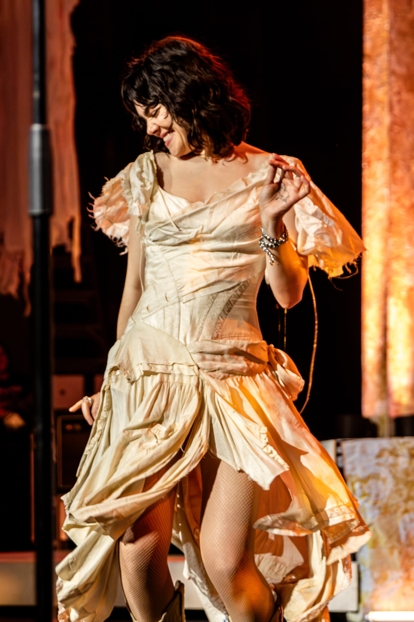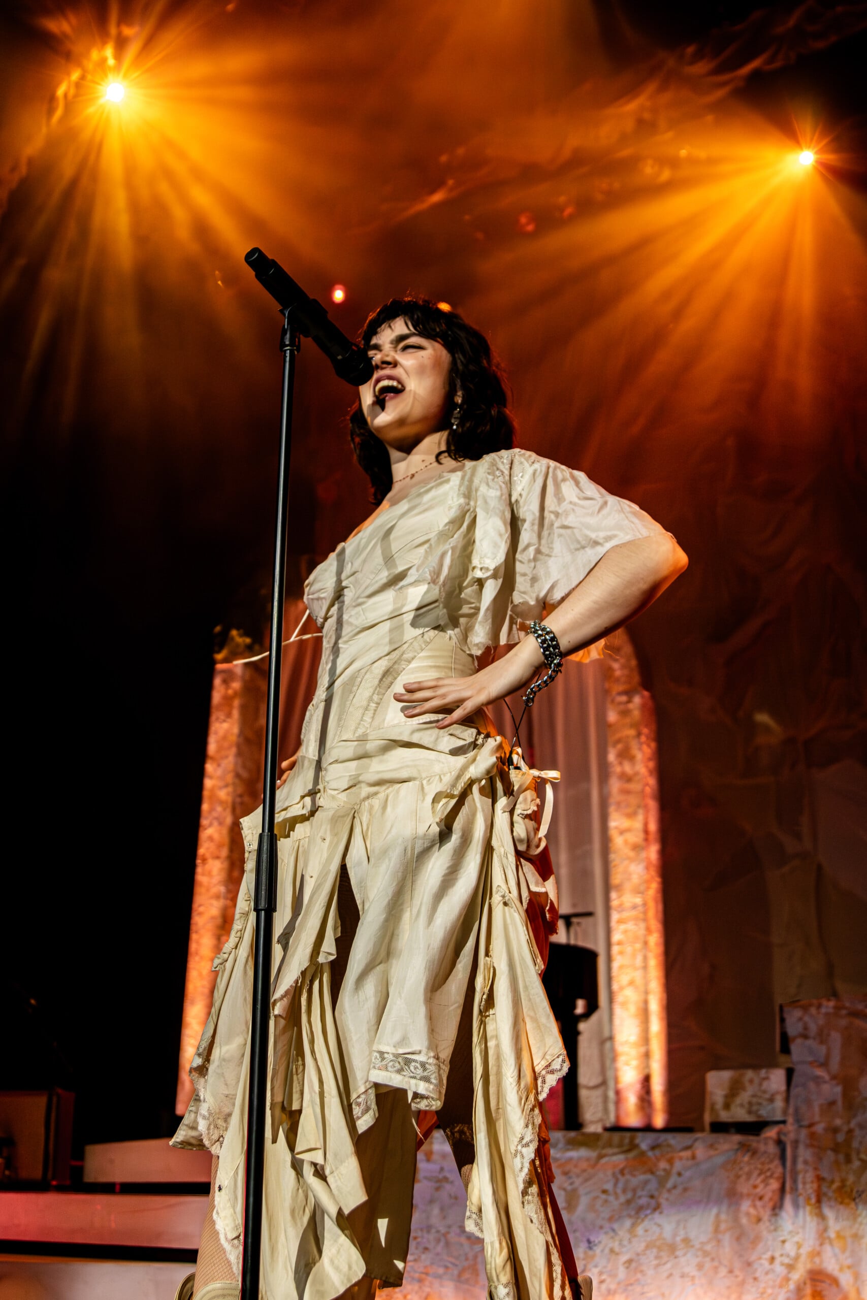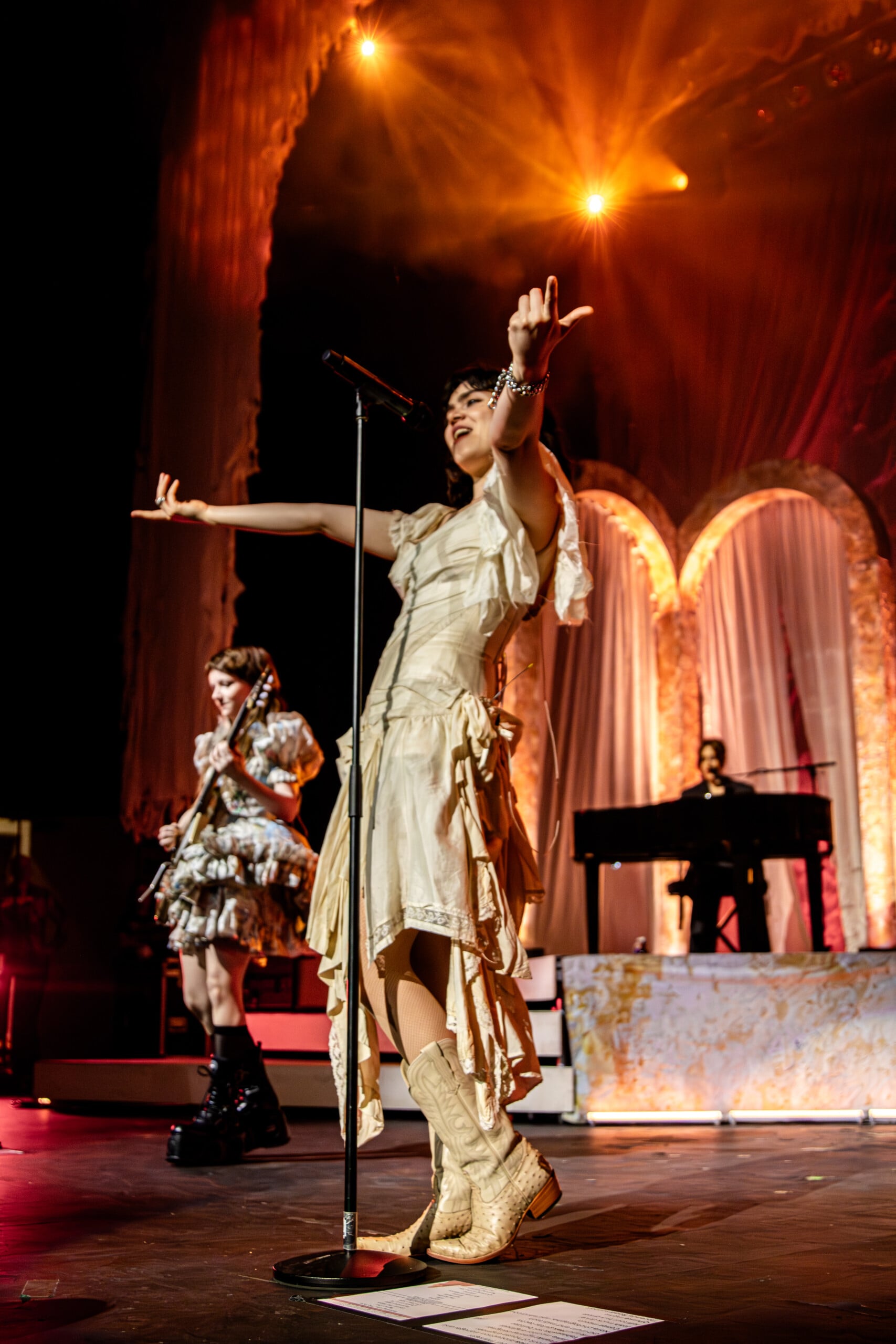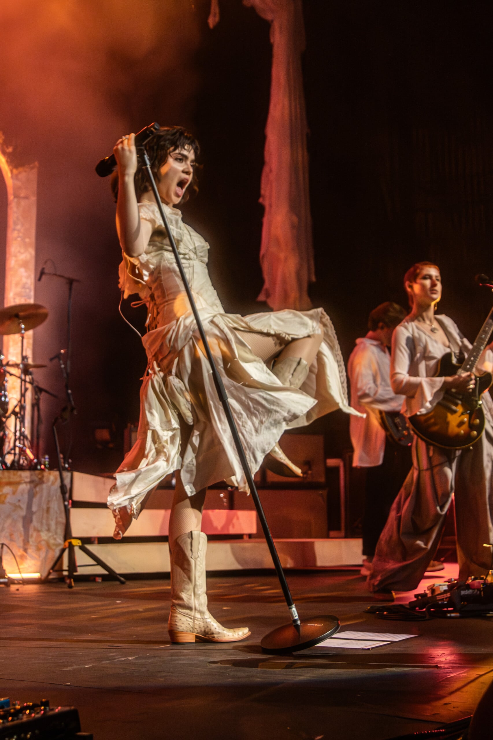 Stage lights glow at times like fire, illuminating the flowing backdrop and staged landscape like a beautiful wasteland utopia. The Last Dinner Party embodies with full ecstasy of being.