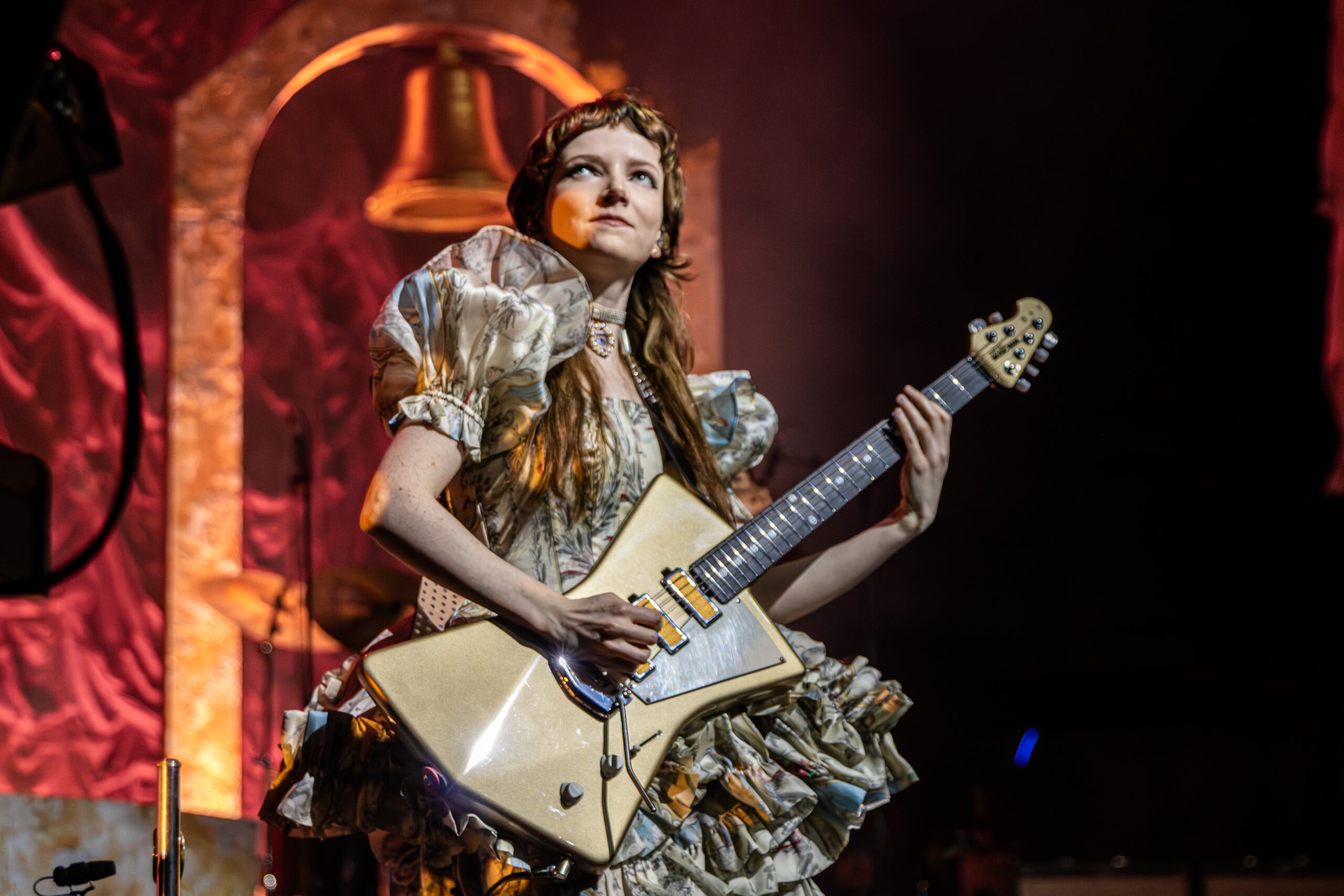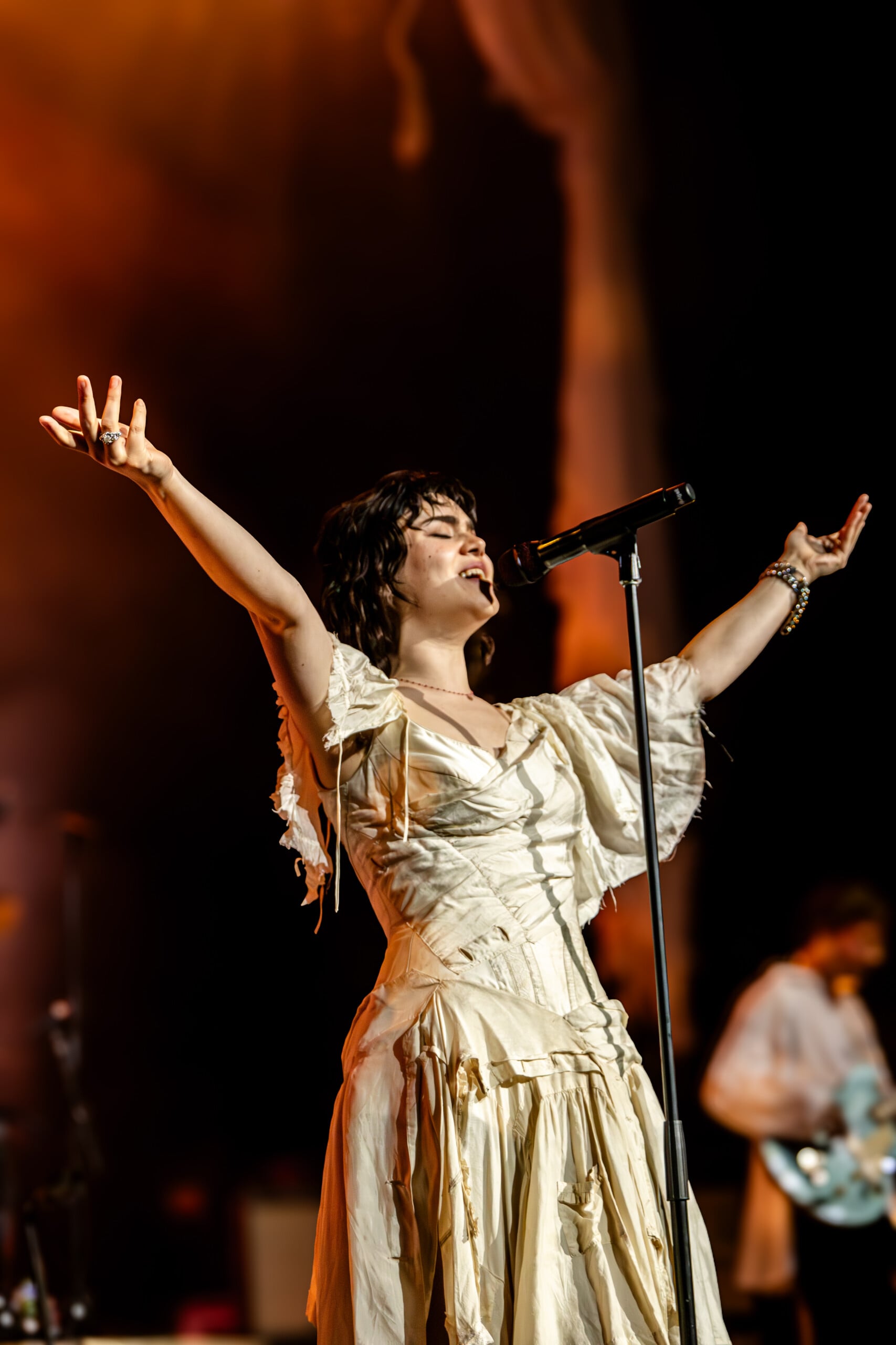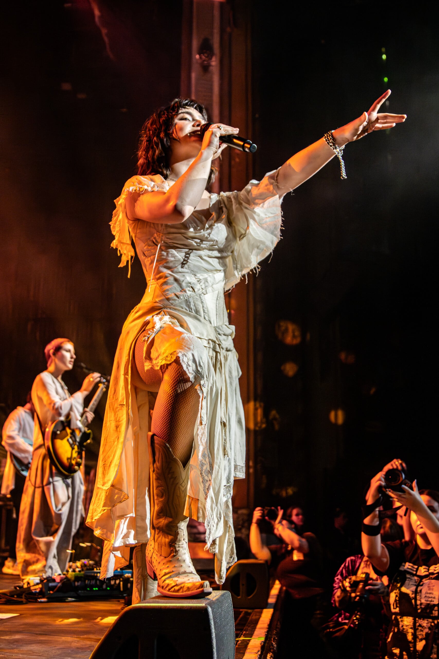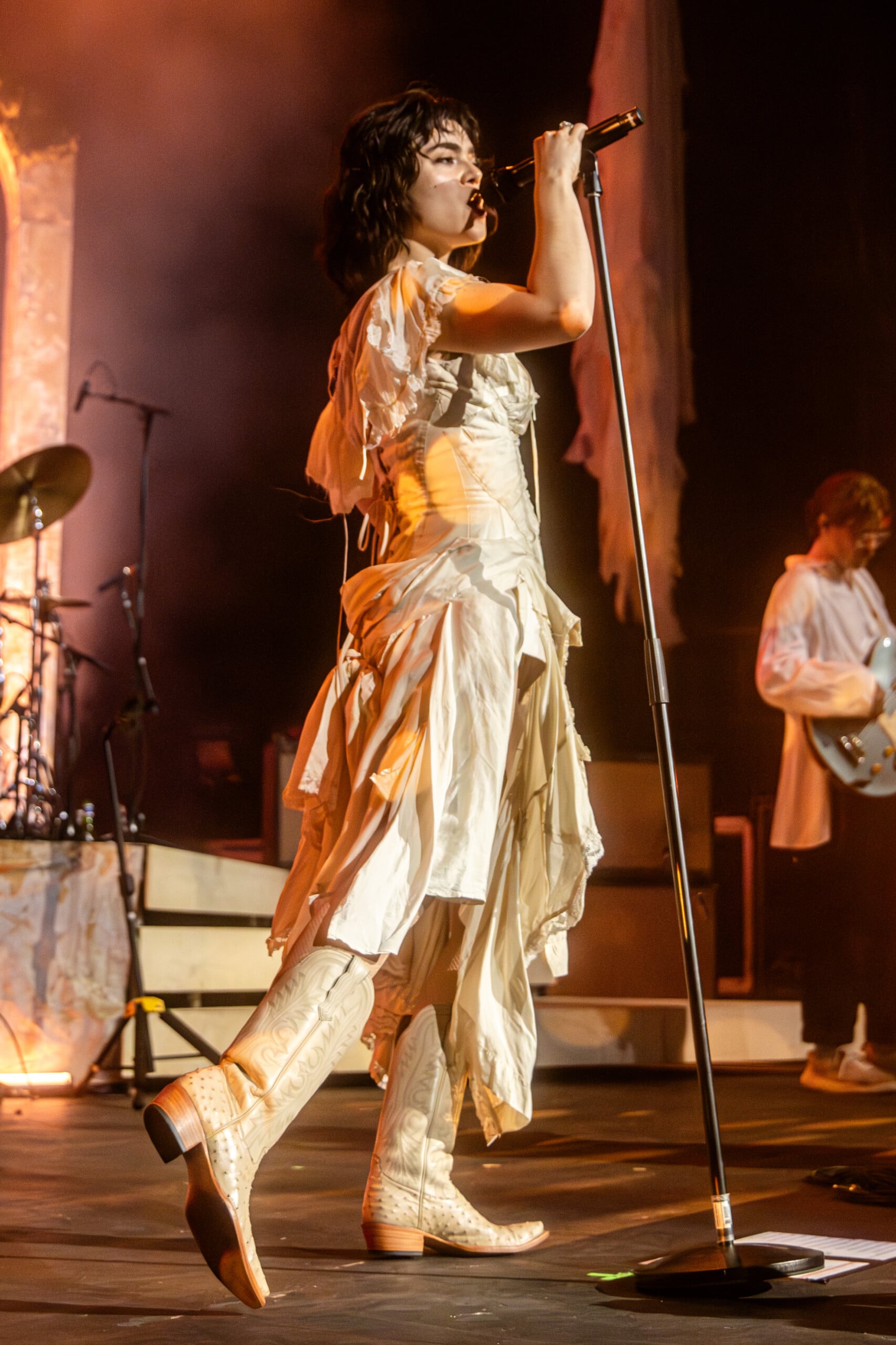 Stage lights glow at times like fire, illuminating the flowing backdrop and staged landscape like a beautiful wasteland utopia. The Last Dinner Party embodies with full ecstasy of being.