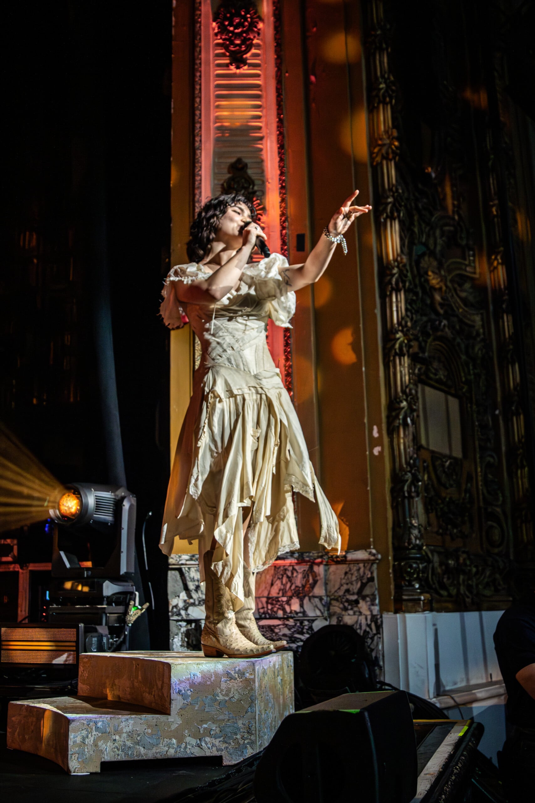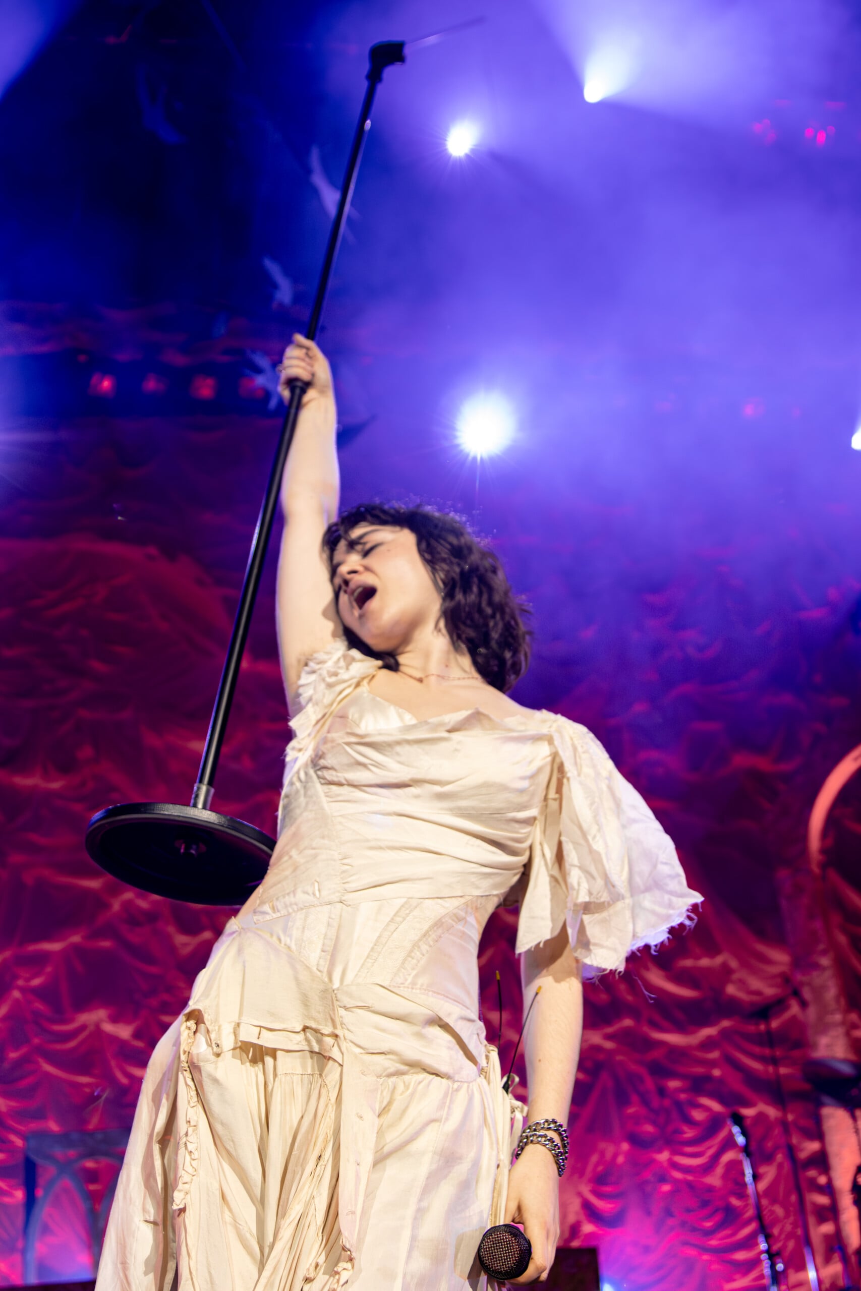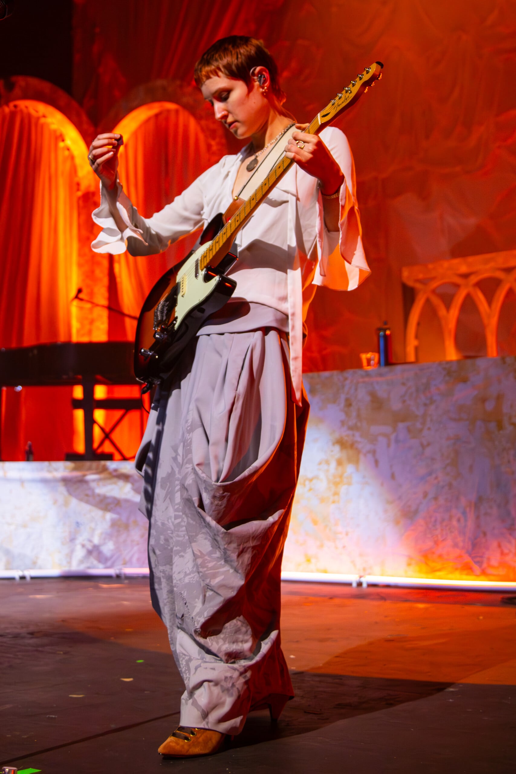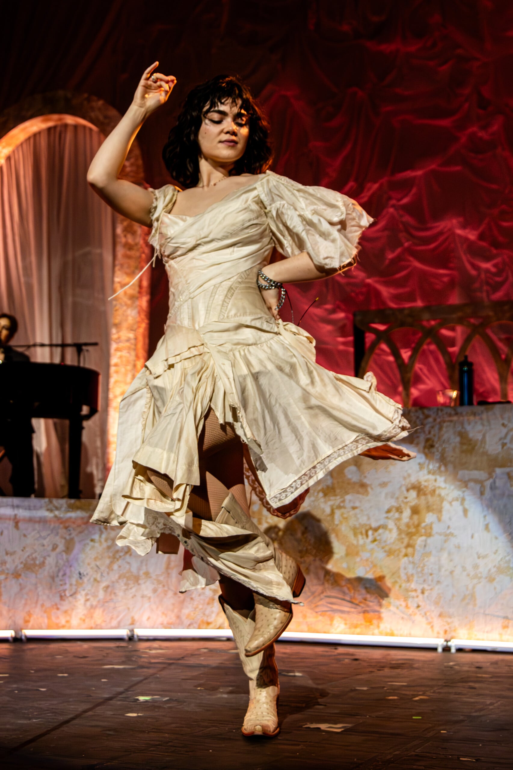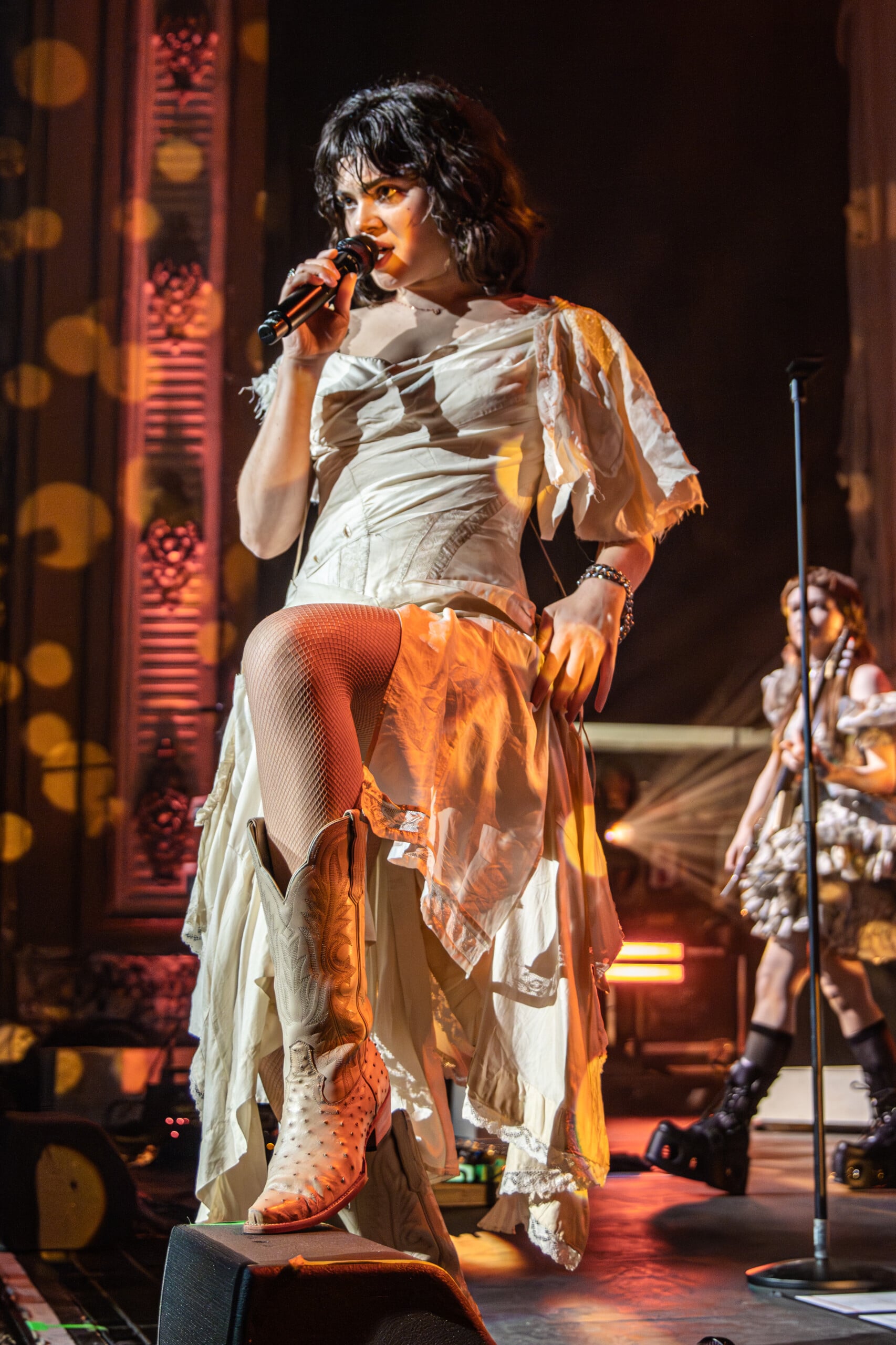 Stage lights glow at times like fire, illuminating the flowing backdrop and staged landscape like a beautiful wasteland utopia. The Last Dinner Party embodies with full ecstasy of being.