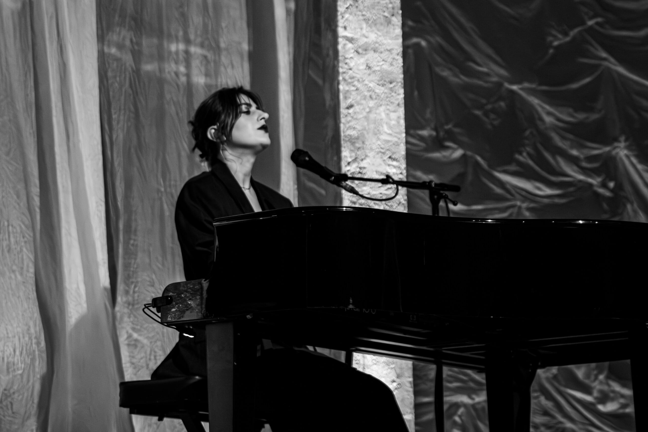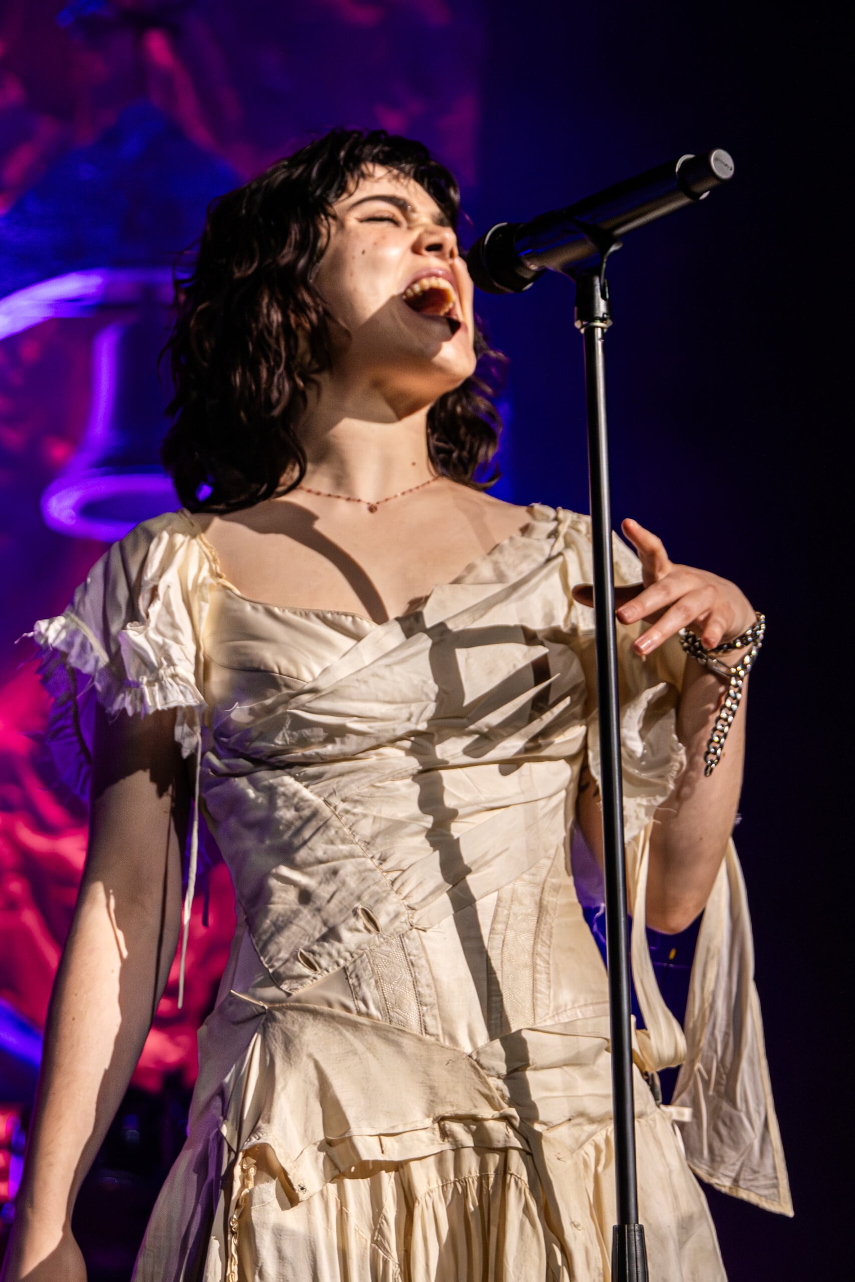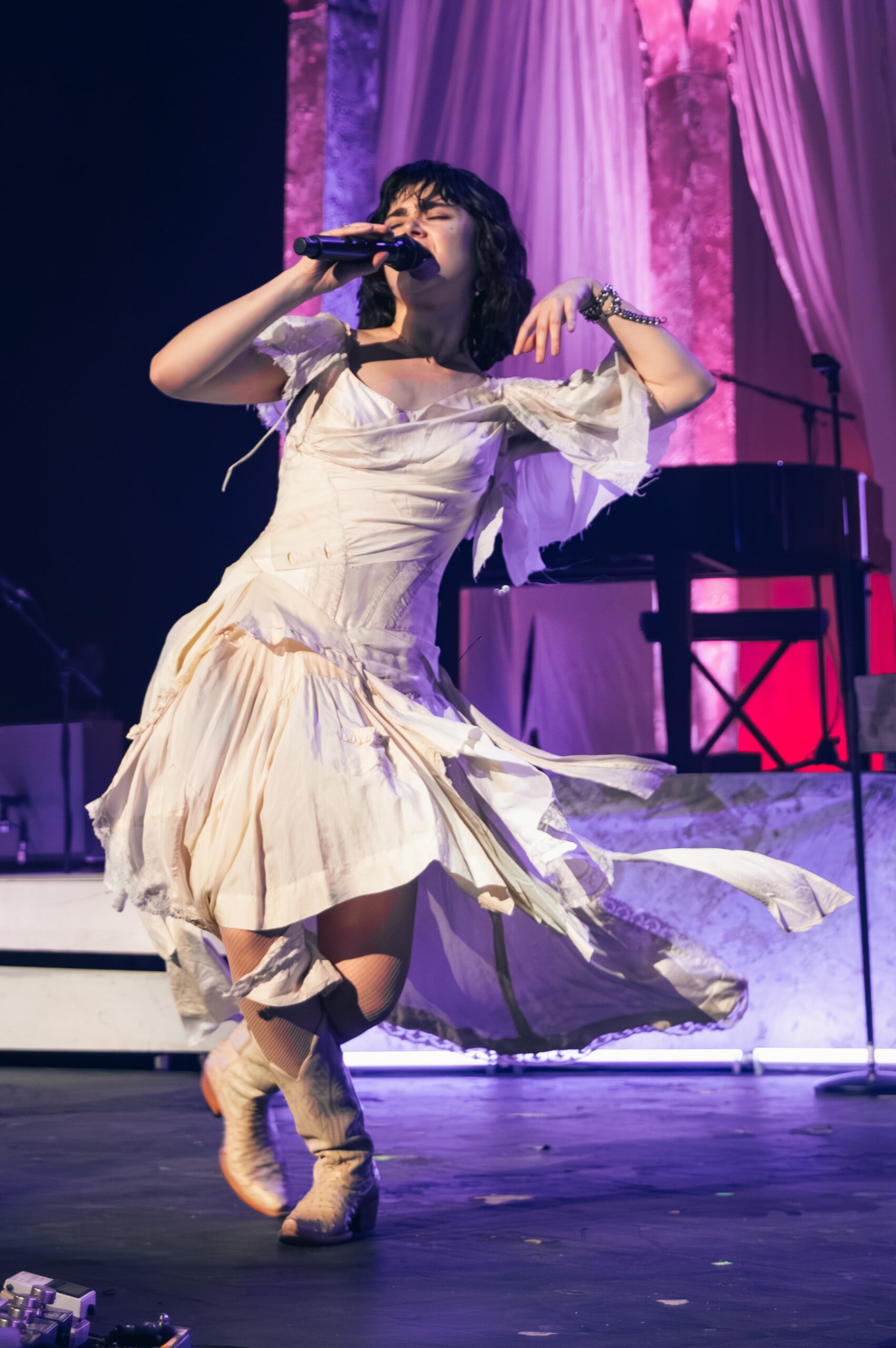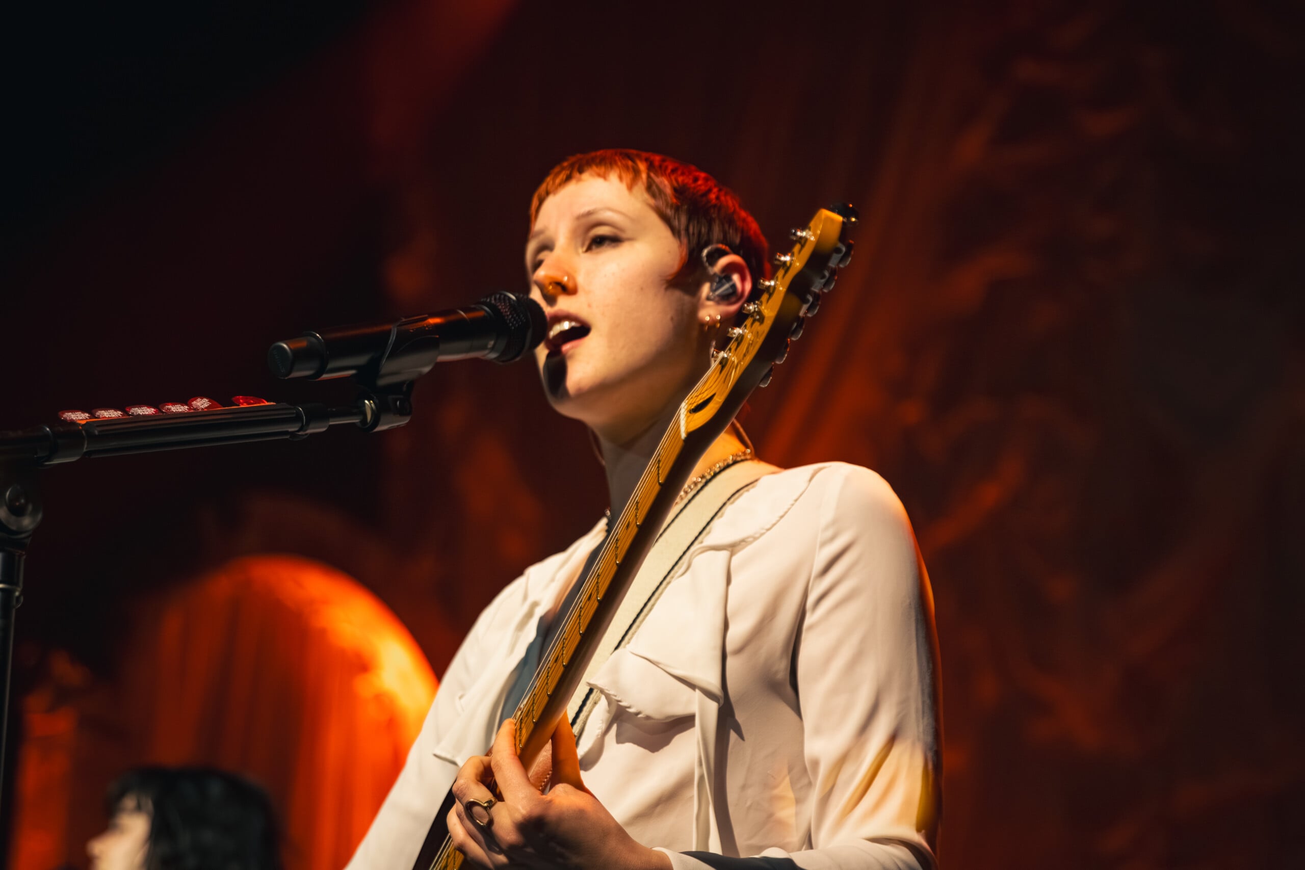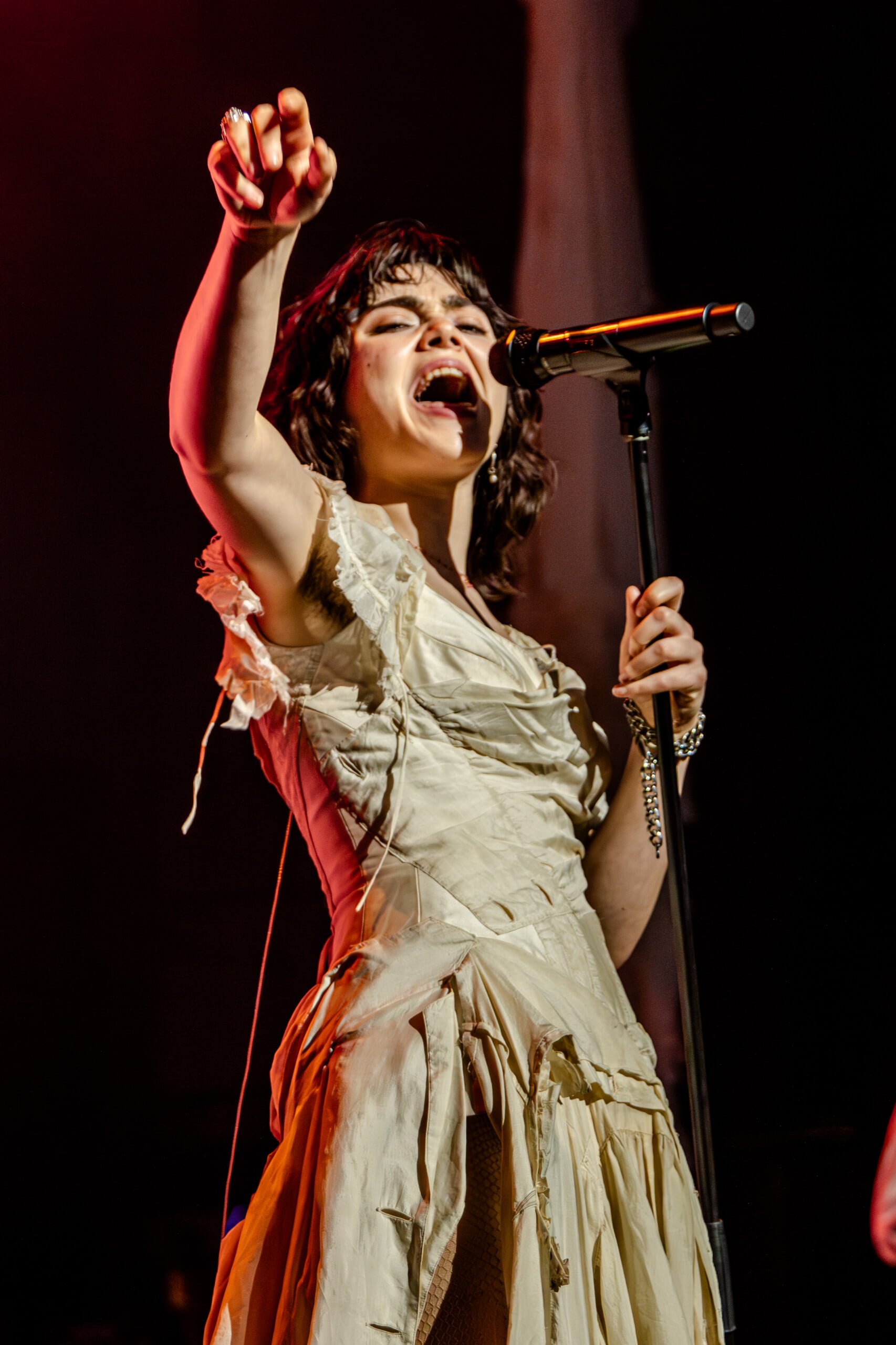 Stage lights glow at times like fire, illuminating the flowing backdrop and staged landscape like a beautiful wasteland utopia. The Last Dinner Party embodies with full ecstasy of being.