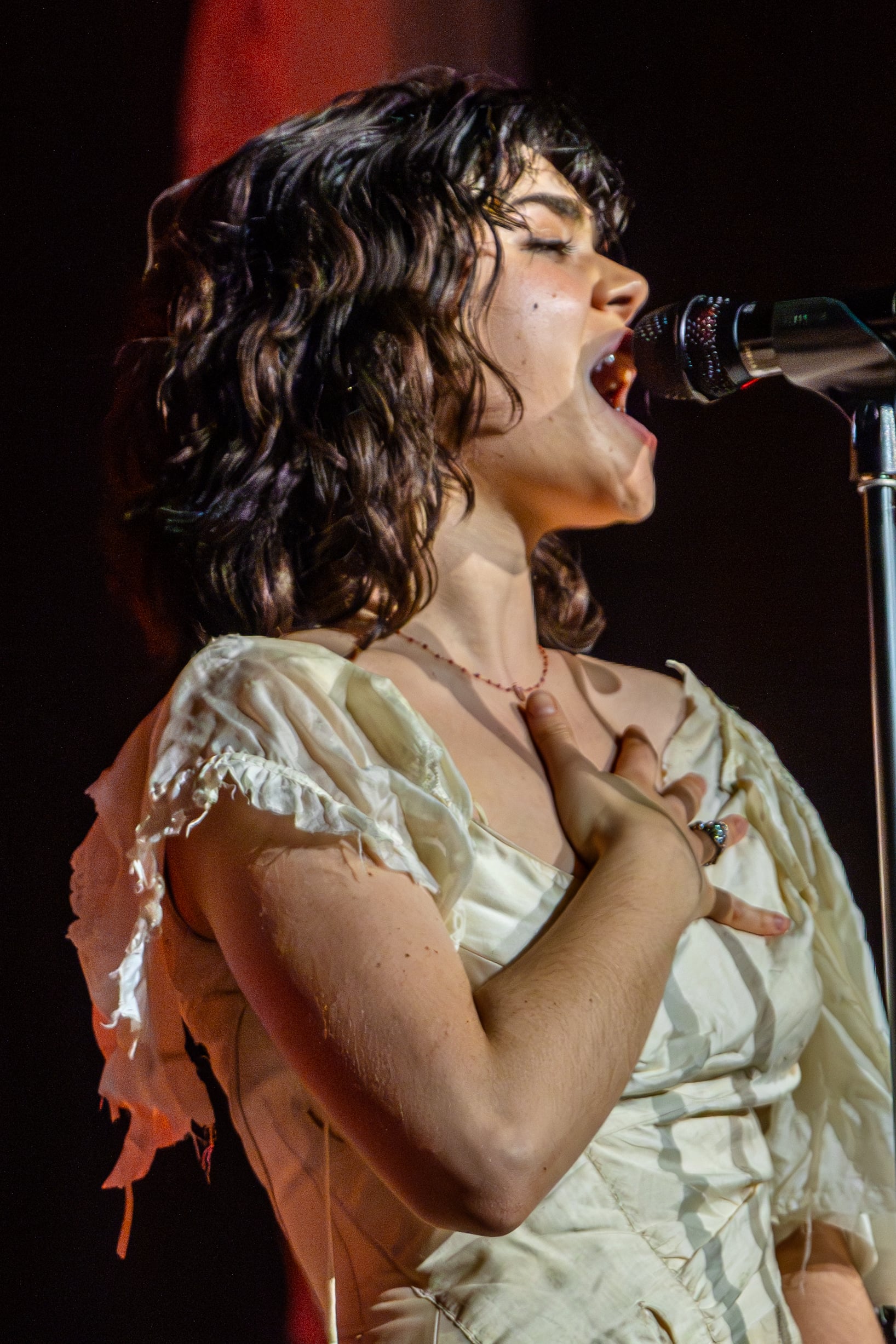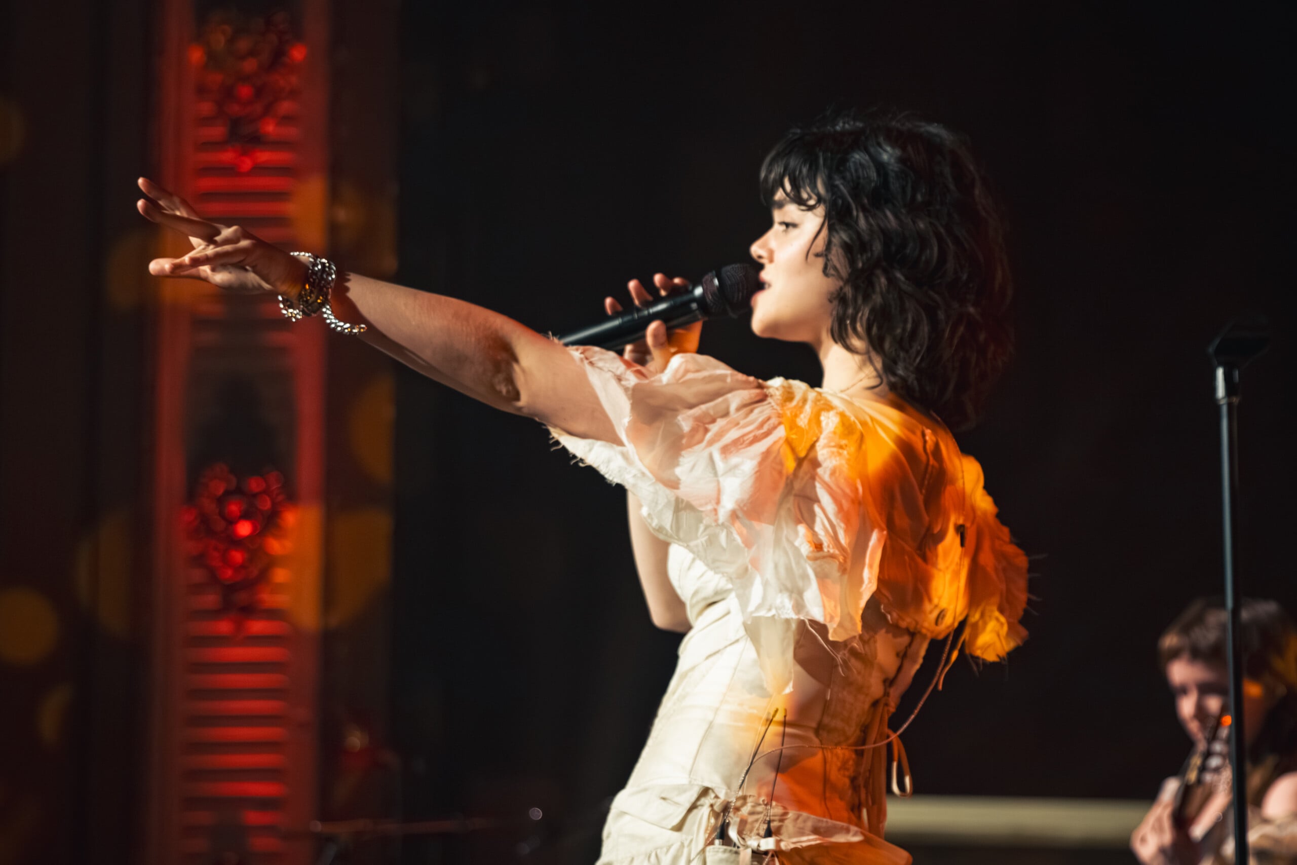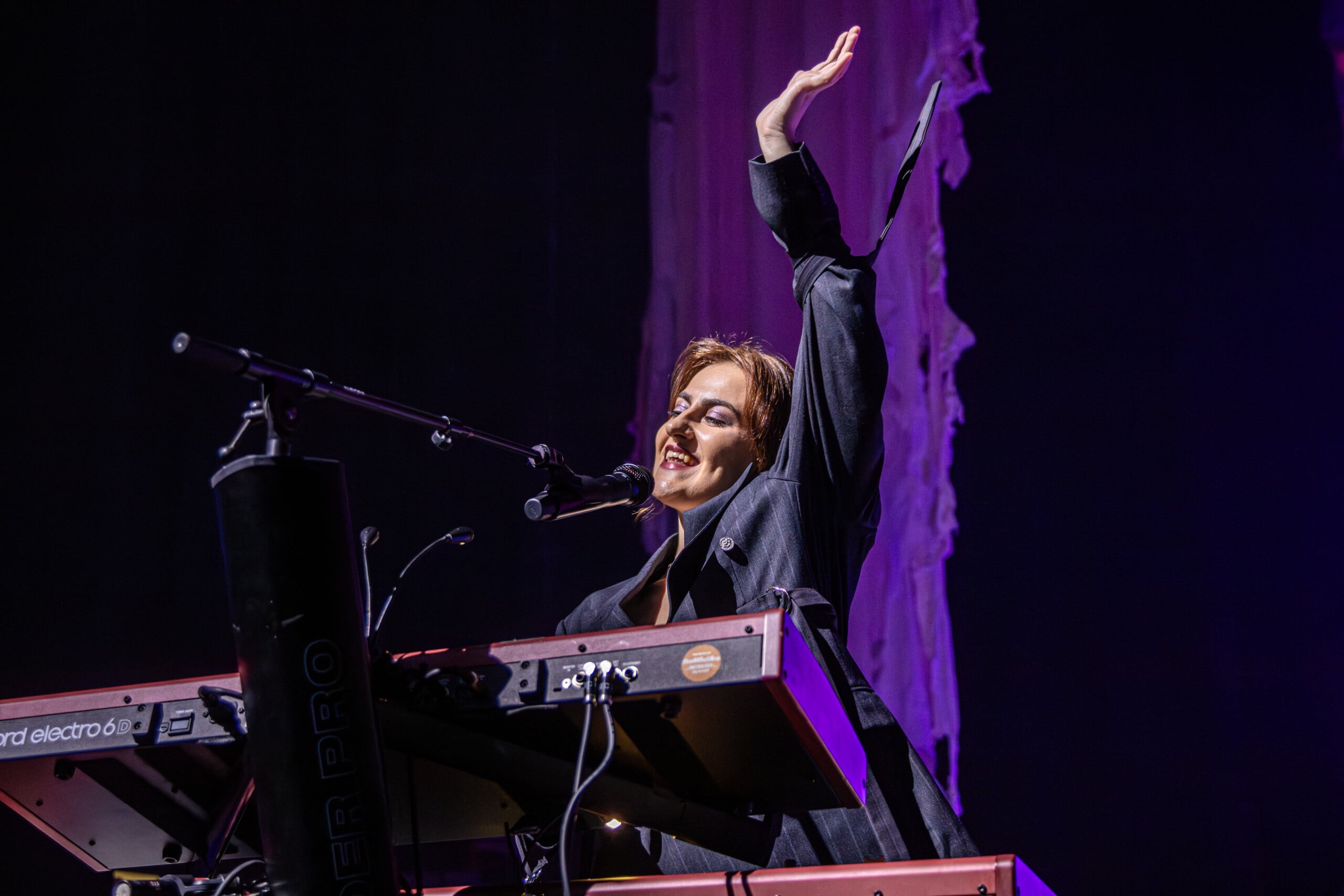 The lights come up, accentuating modern baroque outfits. Abigail Morris on vocals emerges in a laced cream gown with flowing tatters slit up to the hip; Aurora Nishevci dons an angular black pinstripe suit contrasting her red keyboards and black piano; Emily Roberts on lead guitar and mandolin and flute is in gauzy and muted flouncy dress; and Lizzie Mayland on rhythm guitar dappers with a white poet shirt and gray baggy pants so folded they’re skirt-like. Each accentuates their own personality. And as The Last Dinner Party does, they fit together to combine a larger-than-life force in the process.